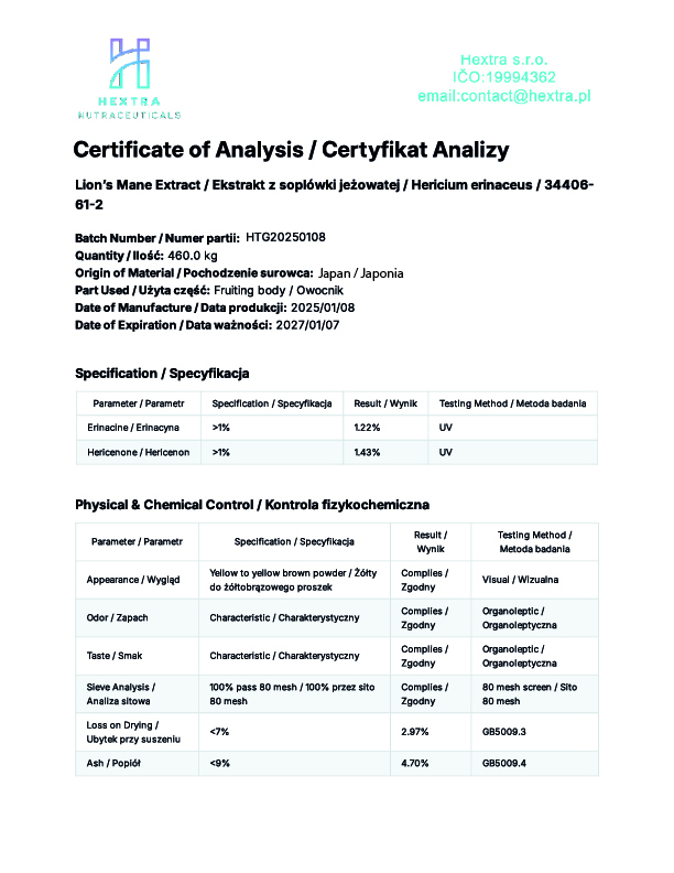 Soplówka Jeżowata Hericium erinaceus Lions mane ekstrakt STANDARYZOWANY hericenonów i erinacyny 2% CERTYFIKAT 60 kaps.