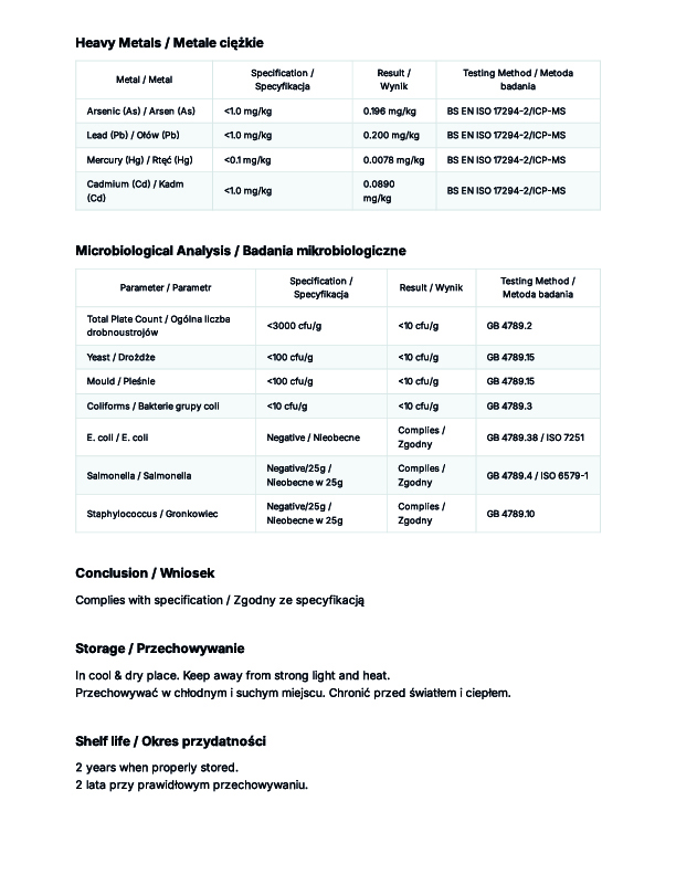 Ilość składników w 1 porcji dziennej (3 kapsułki): 1500 mg ekstraktu z Hericium erinaceus, standaryzowanego na 2% zawartości hericenonów i erinacyny (30 mg łącznie)